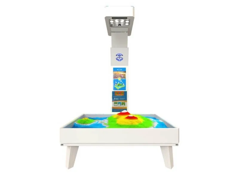 Датчик определяет уровень песка и его рельеф: высокие точки окрашиваются темными цветами, долины и низкие склоны – зелеными, а низины – синими. Это позволяет создать на песке рельеф земной поверхности, включающий горные хребты, луга и водоемы, который можно изменять в режиме реального времени.