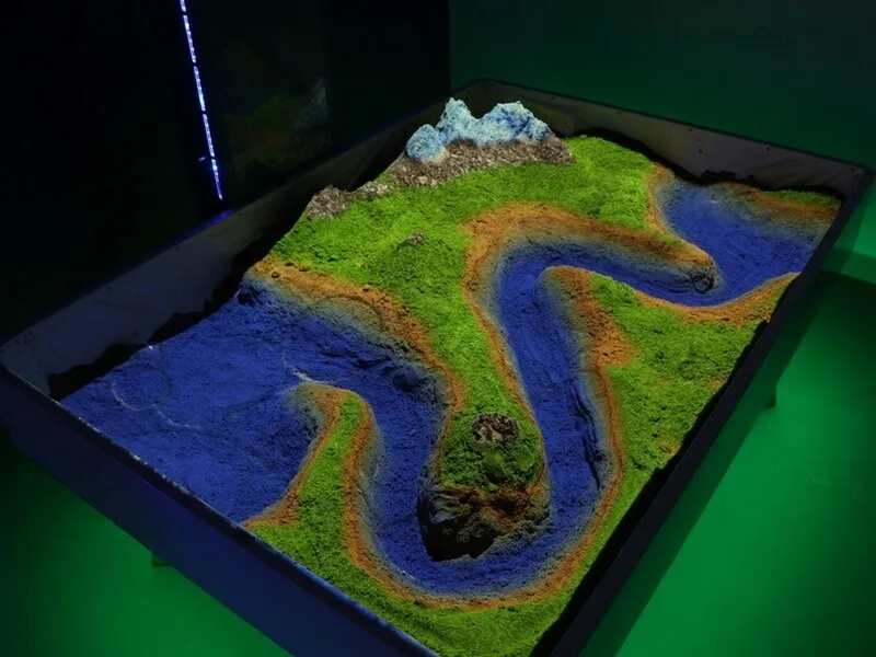 Датчик определяет уровень песка и его рельеф: высокие точки окрашиваются темными цветами, долины и низкие склоны – зелеными, а низины – синими. Это позволяет создать на песке рельеф земной поверхности, включающий горные хребты, луга и водоемы, который можно изменять в режиме реального времени.