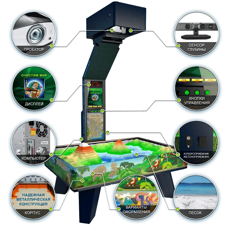 В интерактивной песочнице iSandBOX установлены компьютер, проектор и датчик глубины, а также специальное программное обеспечение. Все они вместе позволяют каждому ребенку создать свой собственный город и воплотить фантазии в жизнь.