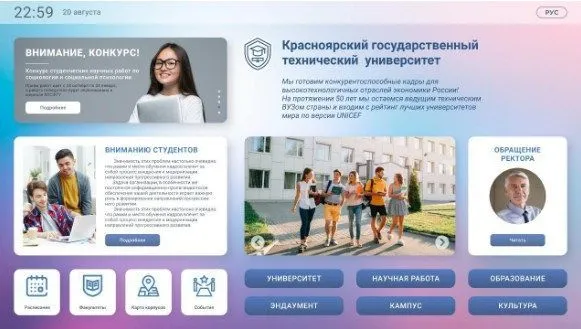 KIOSK INFO «Для образовательных учреждений» создан для автоматизации учебных процессов и упрощения доступа к информации в школах, университетах, институтах, колледжах и техникумах. С его помощью учащийся может самостоятельно получить необходимую информацию о режиме работы учреждения, о его сотрудниках, получить доступ к электронному расписанию и календарю мероприятий, а также посмотреть актуальные вакансии работодателей.