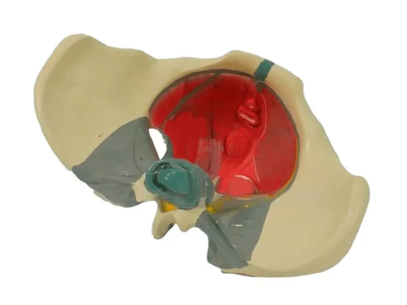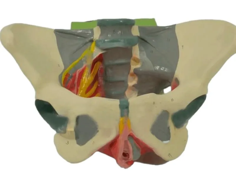 Модель женского таза с выделенными связками, мышцами и нервами