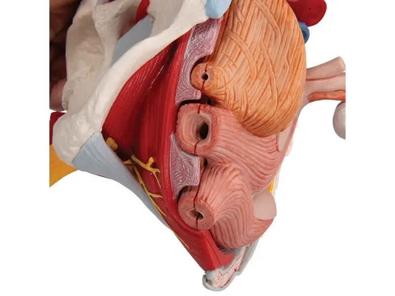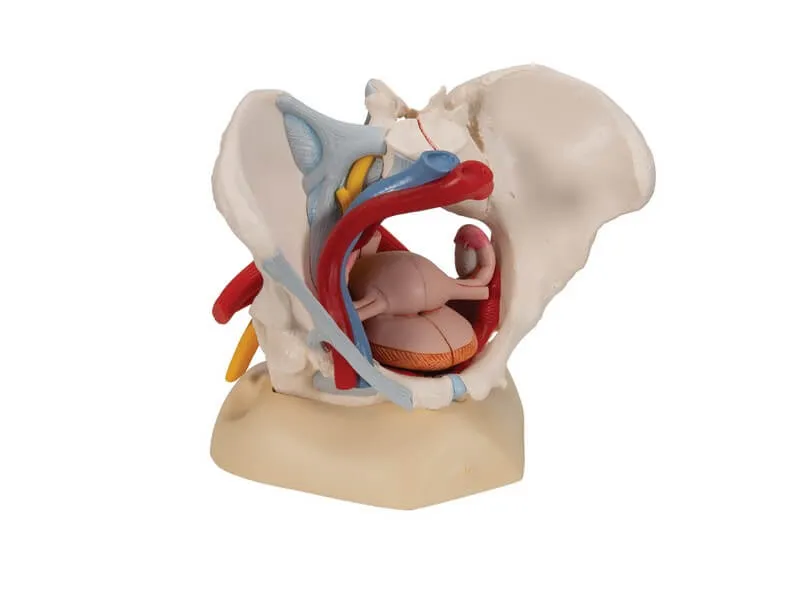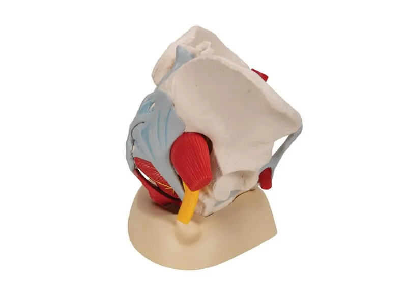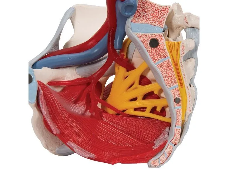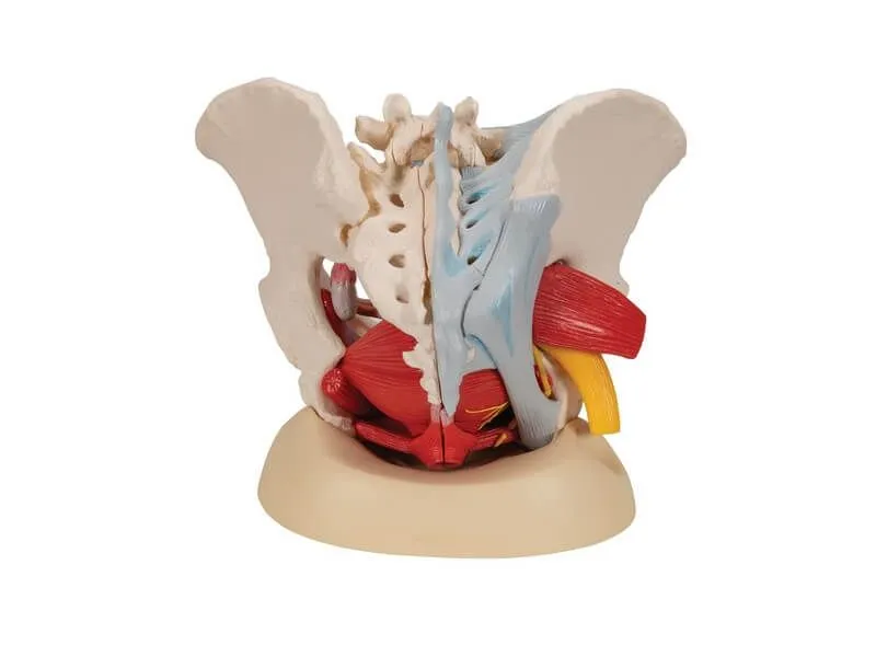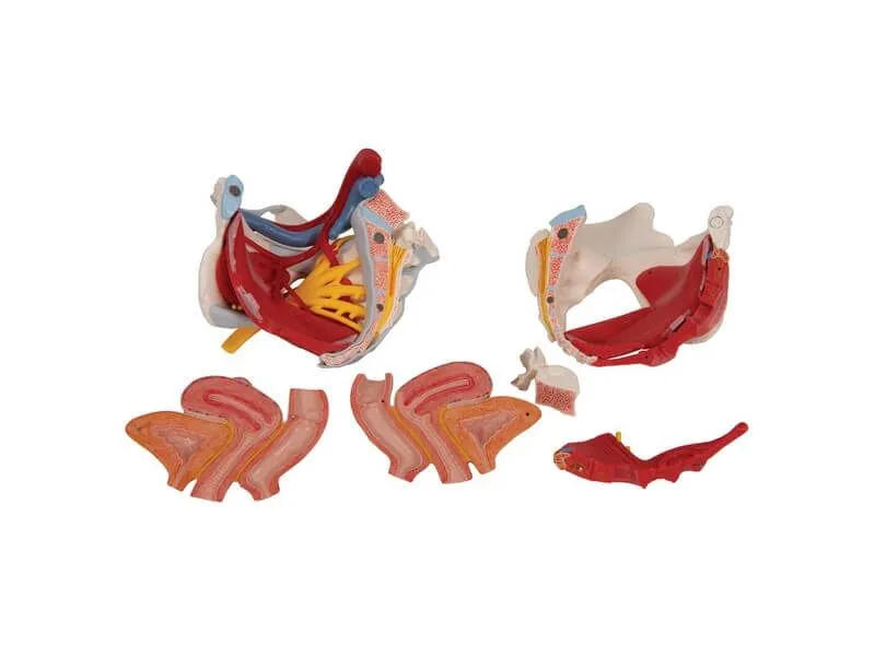 - Модель женского таза показывает тазовое дно с различными слоями, включая наружный сфинктер заднего прохода, наружный сфинктер мочевого пузыря, глубокие и поверхностные поперечные мышцы промежности, а также луковично-губчатую мышцу, все представленные разрезанные вдоль сагиттальной линии