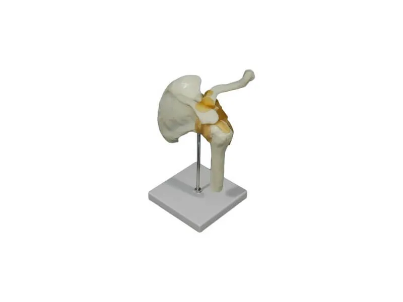 Модель плечевого сустава состоит из лопатки, ключицы, фрагмента плечевой кости, суставной капсулы и имитации связок. Легко закрепляется на подставке и снимается с неё. Модель разработана как демонстрационный материал к курсу анатомии в общеобразовательных школах, средних и высших медицинских учебных заведениях. Изготовлена из поливинилхлорида (ПВХ).