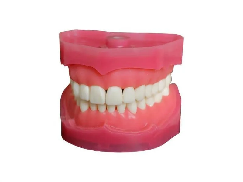 Эта денто-модель верхней и нижней челюстей имеет эластичную десну, которая повторяет зубной ряд взрослого человека. Стабильная окклюзия достигается с помощью набора из 28 модельных зубов.