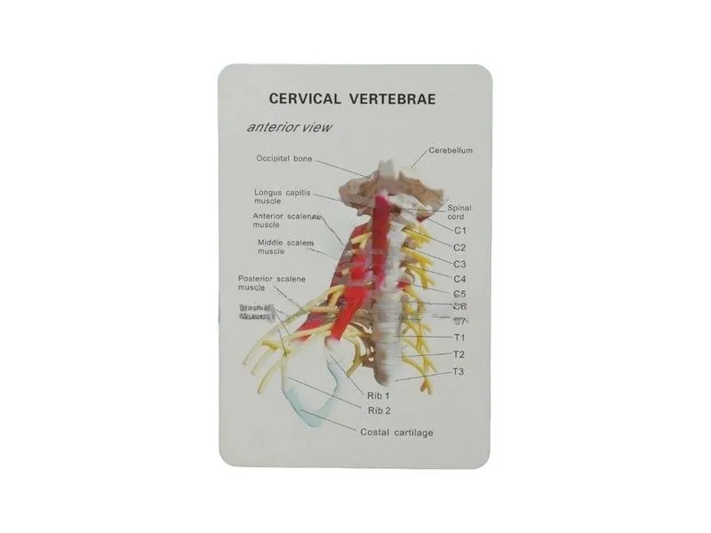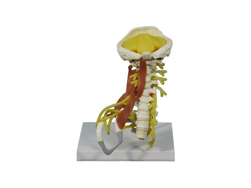 Модель шейного отдела позвоночника взрослого человека, с имитациями нервов и мышц. Комплектуется карточкой со схемой шейного отдела позвоночника (на английском языке). Модель разработана как демонстрационный материал к курсу анатомии в общеобразовательных школах, средних и высших медицинских учебных заведениях. Изготовлена из поливинилхлорида (ПВХ), легко закрепляется на штативе и снимается с него. Модель демонстрирует следующие элементы: 7 шейных позвонков с межпозвонковыми дисками; 3 грудных позвонка с межпозвонковыми дисками затылочная кость; мозжечок; спинной мозг; спинномозговые нервы; плечевое сплетение; длинная мышца головы; передняя лестничная мышца; средняя лестничная мышца; задняя лестничная мышца; рёберный хрящ.