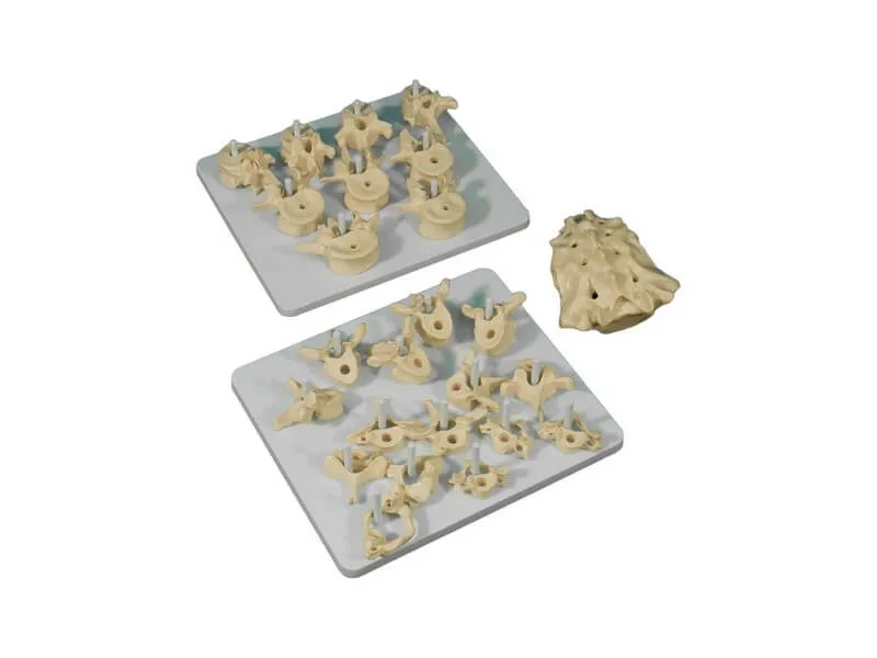 Набор из моделей позвонков человека, выполненных в натуральную величину. В набор входят модели 7 шейных позвонков, 12 грудных позвонков, 5 поясничных позвонков и крестца с копчиком. Набор поставляется в комплекте с 2 подставками и кейсом для хранения.