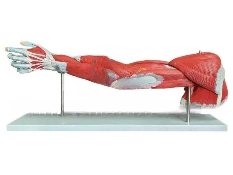 Разборная модель мышц левой руки взрослого человека, выполненная в натуральную величину. Состоит из 7 частей, с высокой анатомической точностью демонстрирует поверхностные и глубокие мышцы, сосуды, нервы и связки. Модель разработана как демонстрационный материал к курсу анатомии в общеобразовательных школах, средних и высших медицинских учебных заведениях. Изготовлена из поливинилхлорида (ПВХ), легко закрепляется на подставке и снимается с неё.