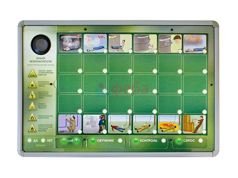 Мобильный модуль тестирования представляет собой электрифицированную панель с отдельной световой индикацией, на которую накладываются фолии по следующим темам: