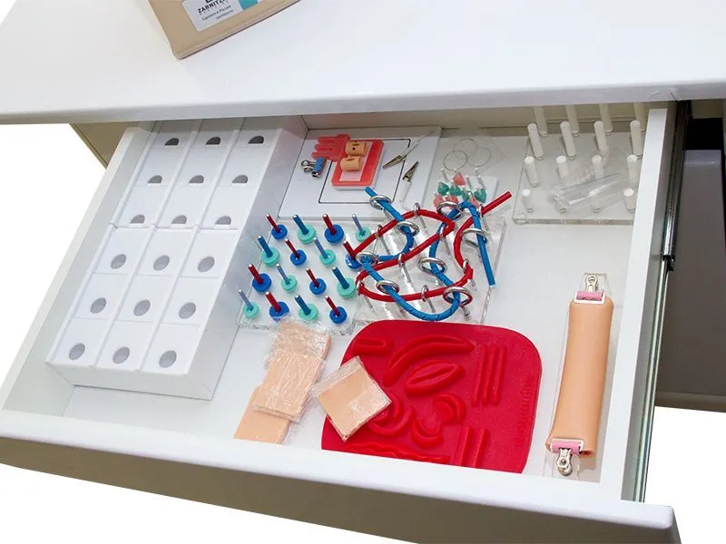 Этот учебно-лабораторный комплекс включает в себя разнообразные тренажеры для хирургической практики. Все они изготовлены из материала, напоминающего кожу реального человека.