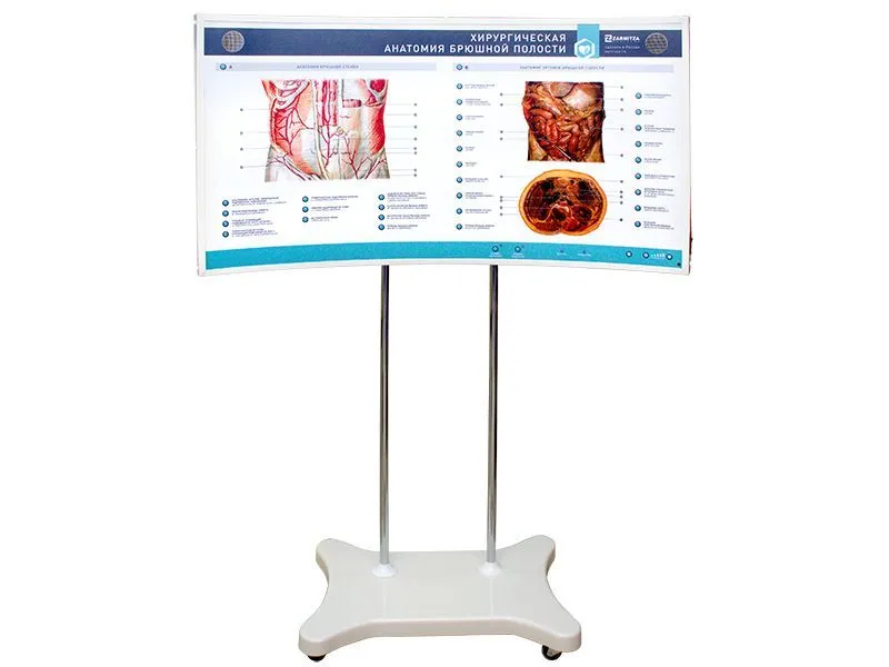 Светодинамические интерактивные стенды комплекта — это панели, отражающие учебную информацию об области живота и передней брюшной стенки. В структуру данного устройства интегрированы чувствительные датчики для управления стендом посредством интерактивных сигналов от приемных и передающих устройств. Тренажер имеет 2 режима работы: «Обучение» и «Контроль».