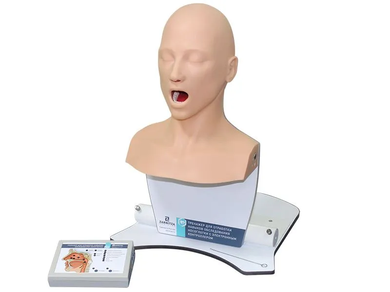 Тренажер медицинский для оториноларингологии выполнен в виде фронтальной части головы человека с шеей и проксимальным торсом, установленным на ее основании. Он имеет регулируемый угол наклона, что позволяет пользователям практиковать осмотр носоглотки, эндоскопический осмотр, осмотр верхнечелюстной и придаточных пазух носа.