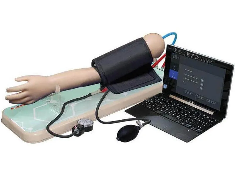 С этим тренажером вы сможете отработать навык замера артериального давления, а также прослушать тоны Короткова с помощью динамиков, которые можно подключать к тренажеру.