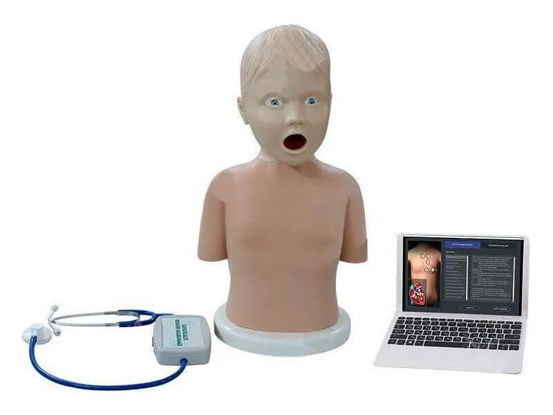 Манекен-тренажер ребенок также оснащен чувствительными радиометками, встроенными в точки аускультации, что позволяет осуществлять интерактивное воздействие с приемопередающими устройствами. При правильном прикосновении к точке фонендоскопа он издает звуки, имитирующие различные сценарии состояния пациента.