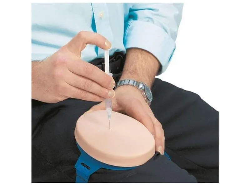 - Тренажер можно носить на различных частях тела (живот, бедро, предплечье), позволяя пациентам вводить жидкость в прокладку и осваивать самостоятельное выполнение инъекций