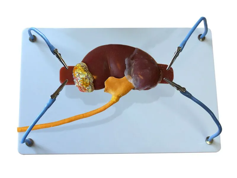 Лапароскопия тренажер выглядит почка с мочеточником, установленная на планшете с возможностью позиционирования. Он предназначен для отработки навыков лапароскопической хирургии, таких как удаление конкрементов, рассечение спаек и удаление кист.
