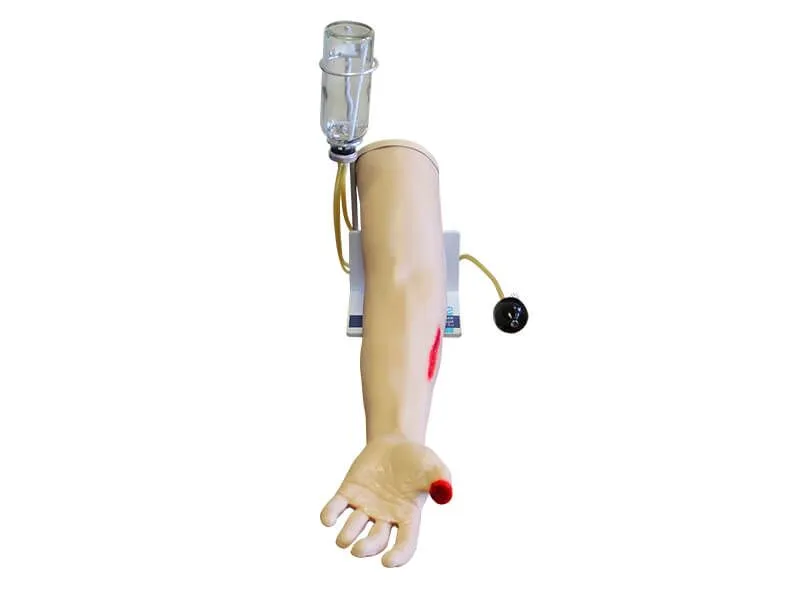 Тренажер по оказанию первой медицинской помощи оснащен системой имитированной циркуляции крови, которая может выделяться из предплечья и большого пальца. Собирать кровь для вторичного использования можно с помощью лотка, идущего в комплекте.