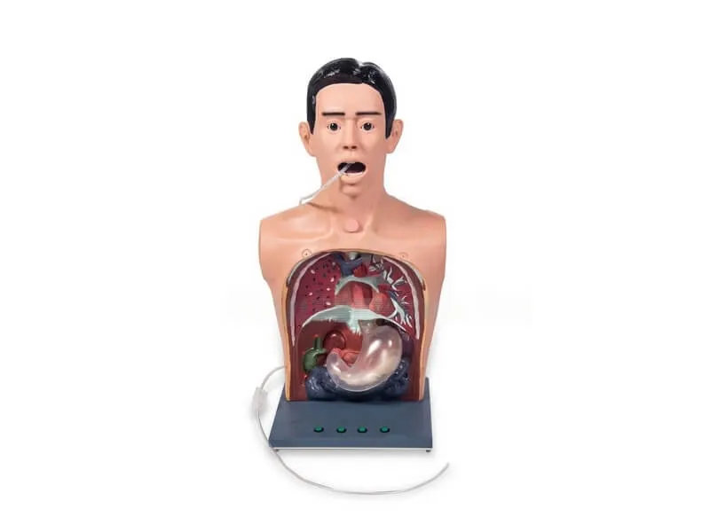 Медицинский манекен-тренажер — это анатомическая модель, представляющая собой торс и голову взрослого человека. Она включает прозрачную стенку для осмотра, а также интегрированный электронный механизм, позволяющий подсвечивать отдельные зоны желудочно-кишечного тракта.