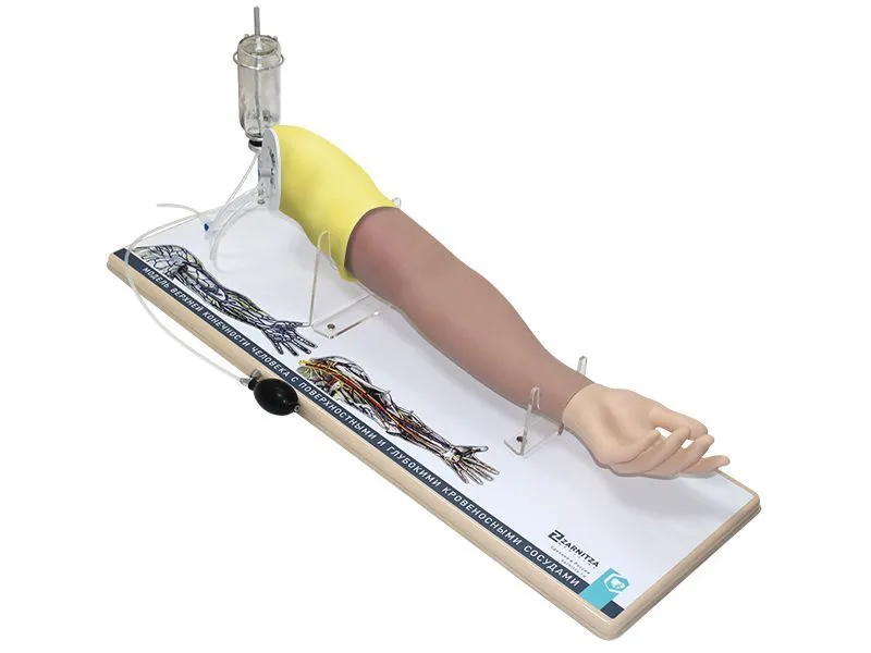 Тренажер медицинский терапевтический представляет собой реалистичную модель верхней конечности человека, включающую имитацию ношения коротких рукавов.