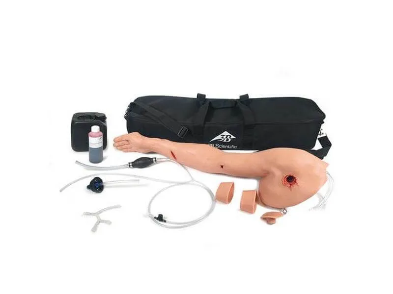Тренажер для остановки кровотечения из верхней конечности с реалистичной имитацией ран и кровотечения позволяет повысить эффективность обучения уходу за пациентами благодаря теоретической и практической подготовке по остановке кровотечения с наложением повязок и жгута. Подойдет для применения в рамках курсов по оказанию тактической медицинской помощи раненым в бою (TCCC) и оказанию гражданской медицинской помощи при ранениях.