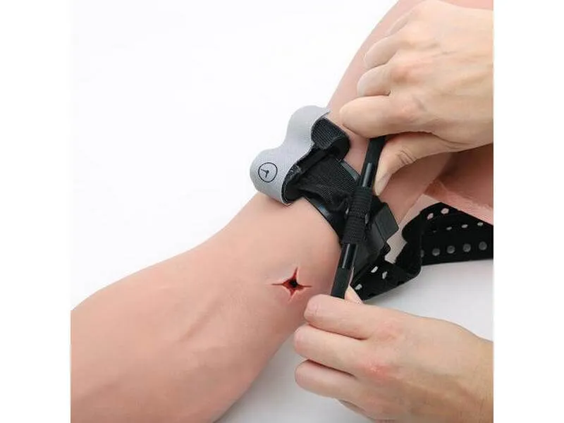 Тренажер для обучения остановки кровотечения позволяет практиковаться на сложных кровотечениях с наложением жгута и повязок.