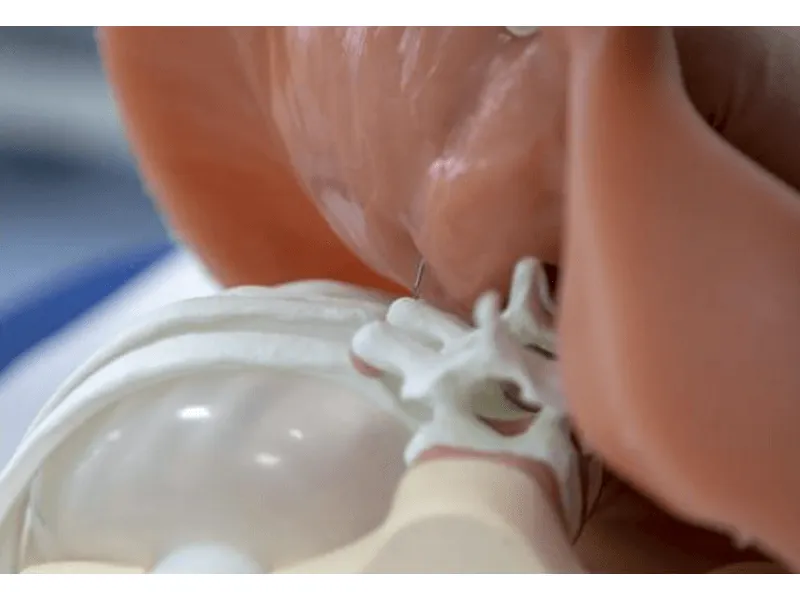 Манекен для инъекций имеет анатомически точную костную структуру (позвонки T3-T8, ребра 3-8) и реалистичную тактильную обратную связь в ходе практики. Кроме того, он выполнен из самовосстанавливающегося материала, который позволяет многократно использовать тренажер.