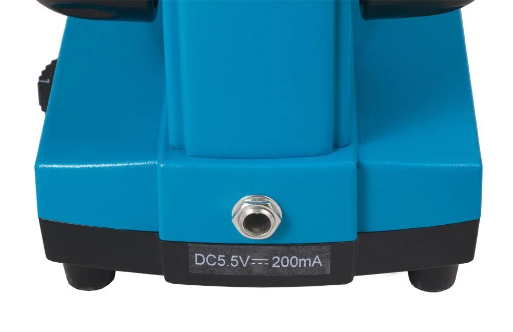 Корпус сделан из пластика высокой прочности, поэтому при небольшом весе микроскоп получился очень надежным. Чтобы школьник не уставал при работе с прибором, окулярная насадка наклонена под углом 45°. Микроскоп работает от сети, но, если рядом нет розетки, можно использовать батарейки.