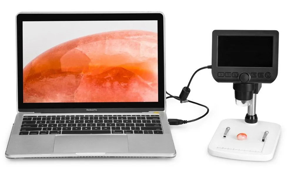 В качестве объектива в микроскопе выступает цифровая камера с сенсором 0,3 Мпикс. Она формирует картинку и выводит ее на встроенный ЖК-экран. Кроме того, доступна функция фото- и видеозаписи. Качество изображения настраивается программно. Для хранения записанных материалов используется карта памяти – она включена в комплект поставки. В комплекте есть и диск с программой для обработки снимков. Она устанавливается на компьютер и позволяет управлять яркостью и контрастностью изображения, наносить надписи на фотоснимки, измерять угловые и линейные размеры образцов.