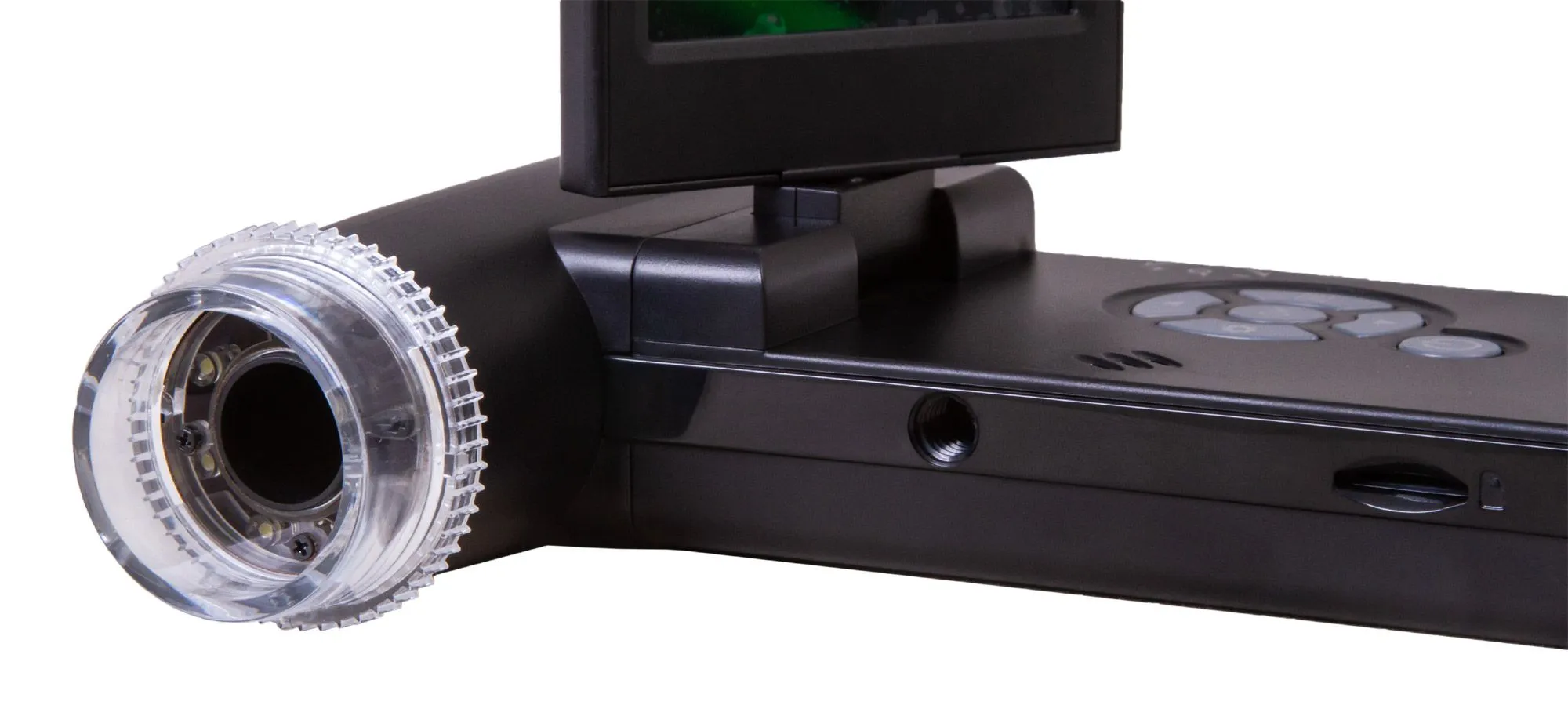 Изображение формирует камера с 5-мегапиксельным сенсором. Она выводит цветную картинку на встроенный ЖК-экран в высоком разрешении. Экран поворотный, его можно установить в наиболее удобное для работы положение. Кроме того, микроскоп может фотографировать и записывать видеоролики (требуется карта памяти, в комплект поставки не входит). Делается это всего одной кнопкой на корпусе. При необходимости Levenhuk DTX 700 Mobi можно подключить к внешнему устройству: монитору, телевизору или компьютеру. Все необходимые кабели уже включены в комплект поставки.