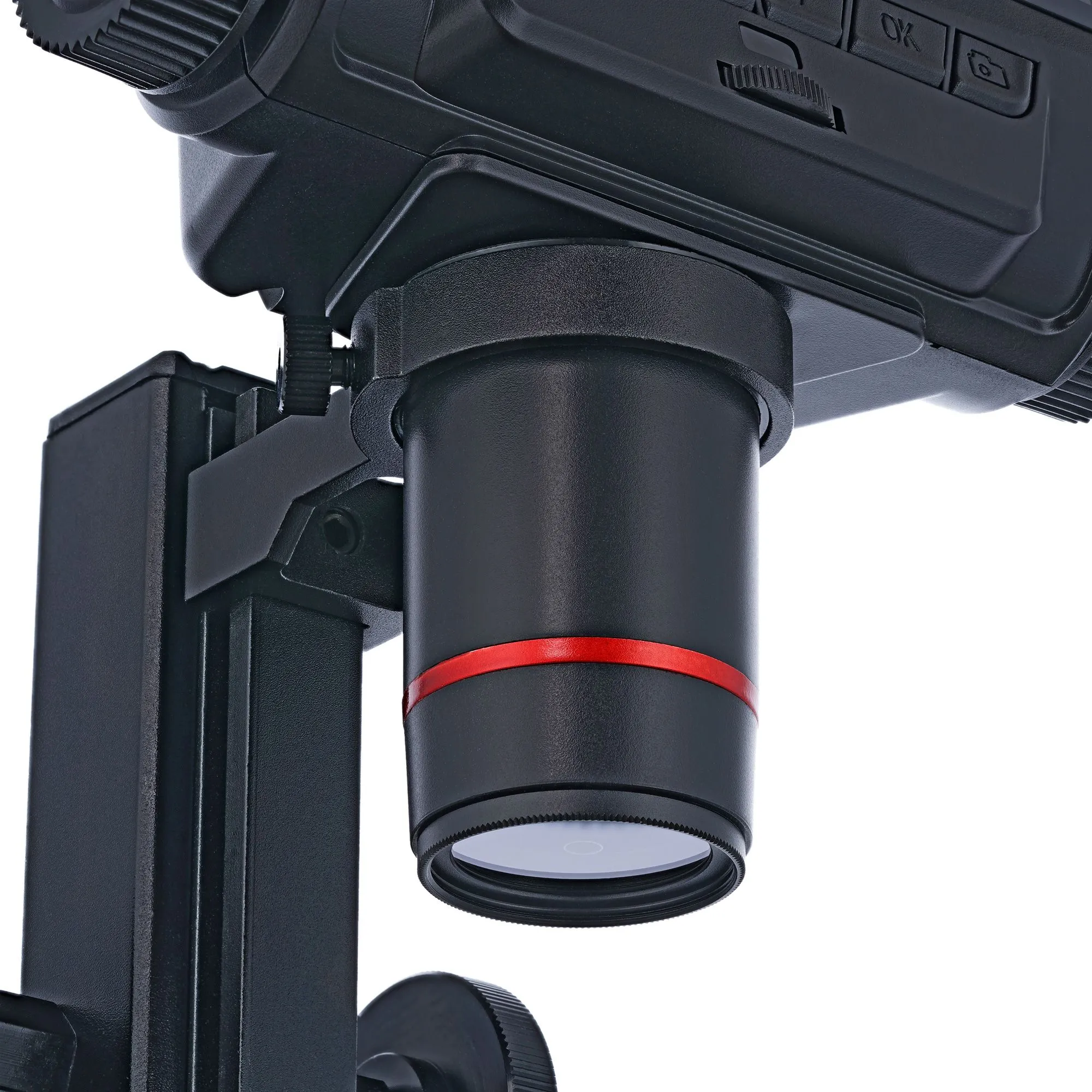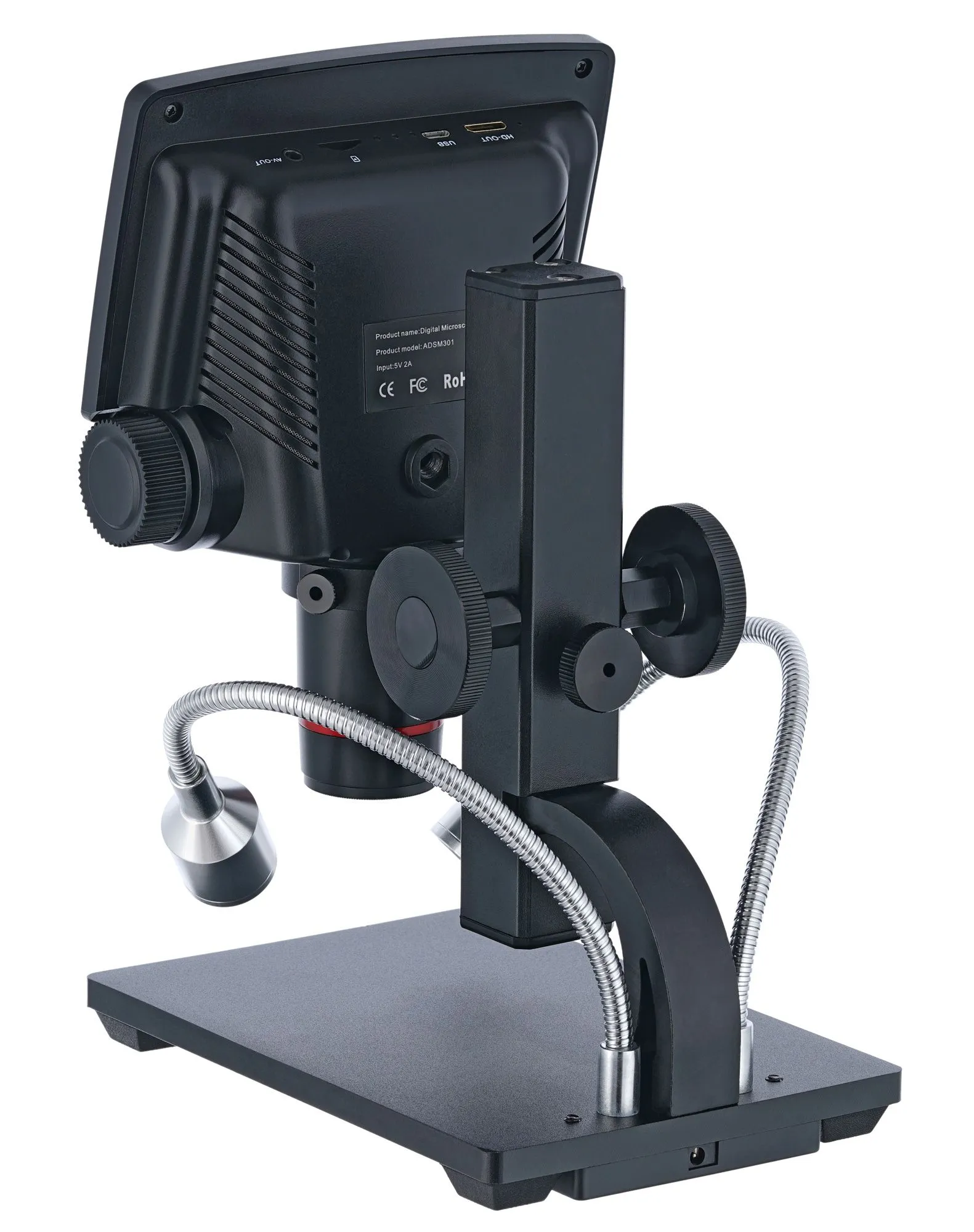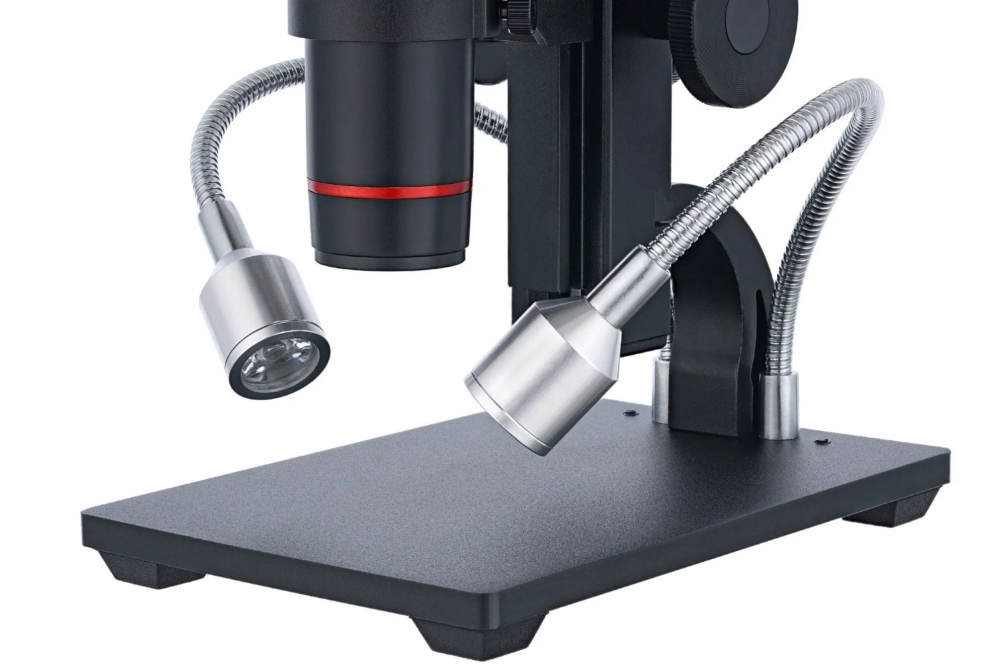 Подсветка расположена над предметным столиком, поэтому все исследования ведутся в отраженном свете. Два светодиода закреплены на гибких держателях, которые позволяют направить свет под углом, создав тем самым более объемное и яркое освещение. Яркость подсветки можно регулировать при помощи переключателя на кабеле питания.