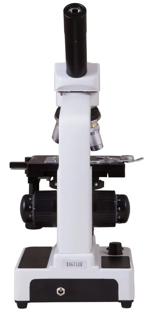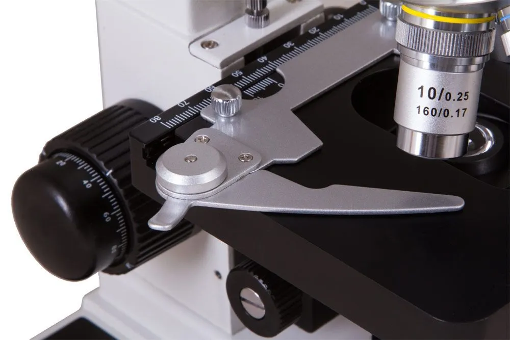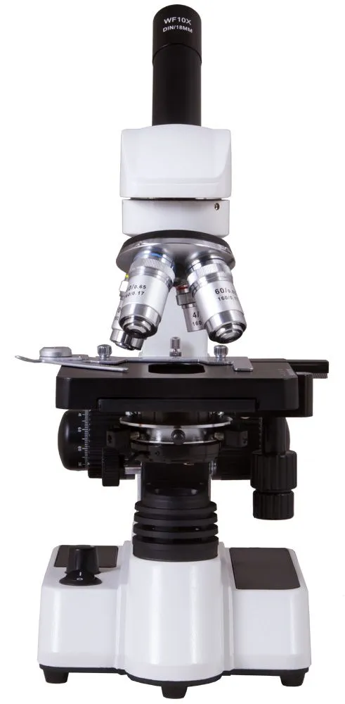Оптическая система микроскопа состоит из монокулярной поворотной на 360° насадки и револьверного устройства на 4 объектива. В комплект поставки включены: окуляр 10х и объективы 4х, 10х, 40х и 60х. Все объективы ахроматические, поэтому оптика минимизирует аберрации и выравнивает поле зрения.