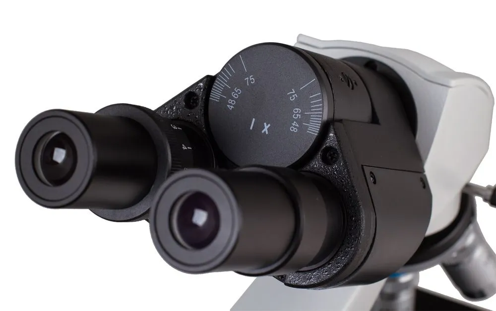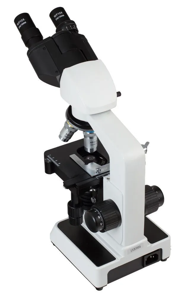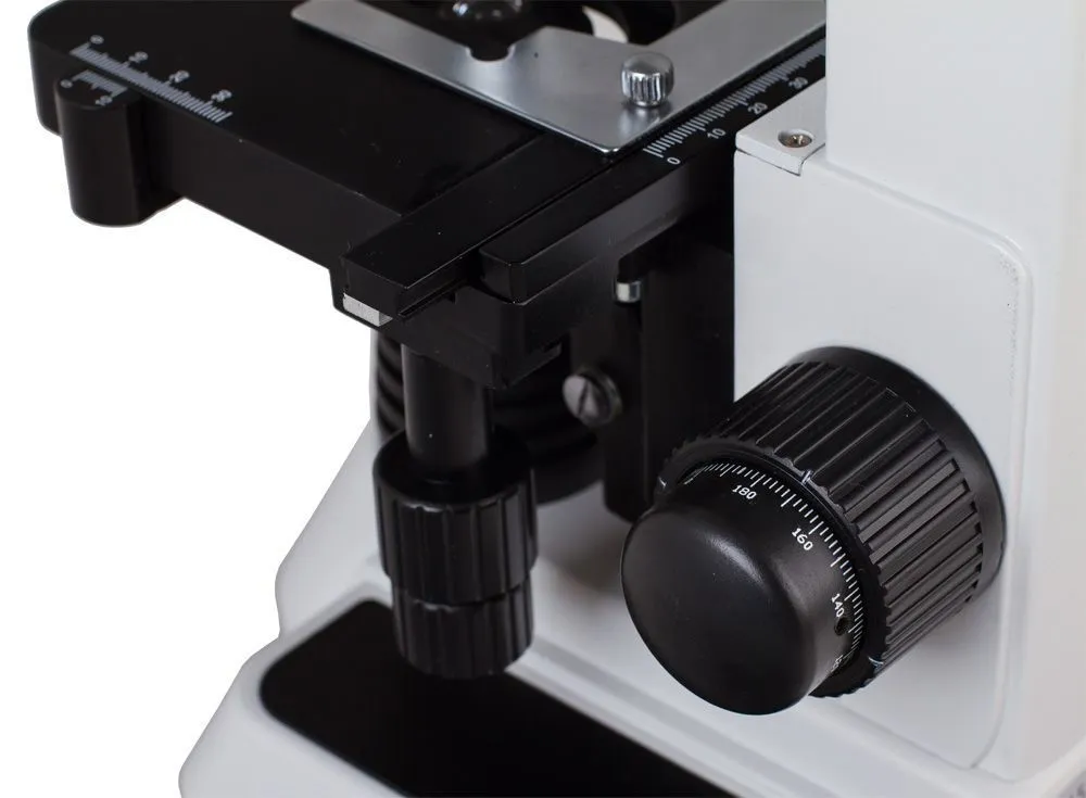 Предметный столик с нониусом снабжен препаратоводителем, ручки грубой и тонкой фокусировки обеспечивают максимально точное позиционирование объекта под объективом микроскопа. Револьверное устройство на 4 объектива и комплектные окуляры 10x обеспечивают увеличения от 40 до 1000 крат. 100-кратный объектив позволяет проводить наблюдения по методу масляной иммерсии.