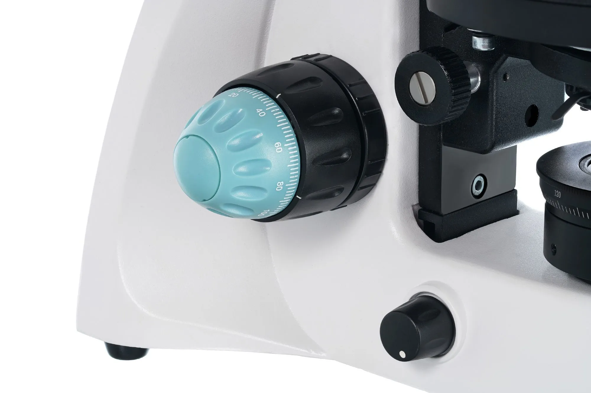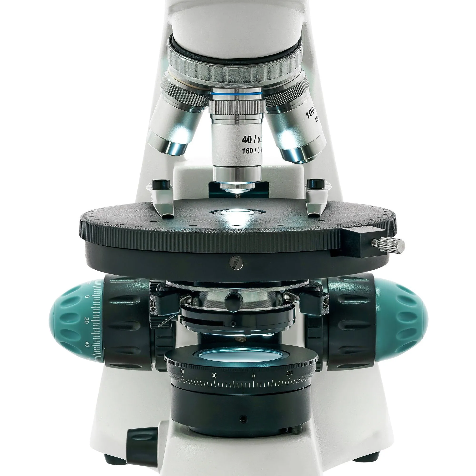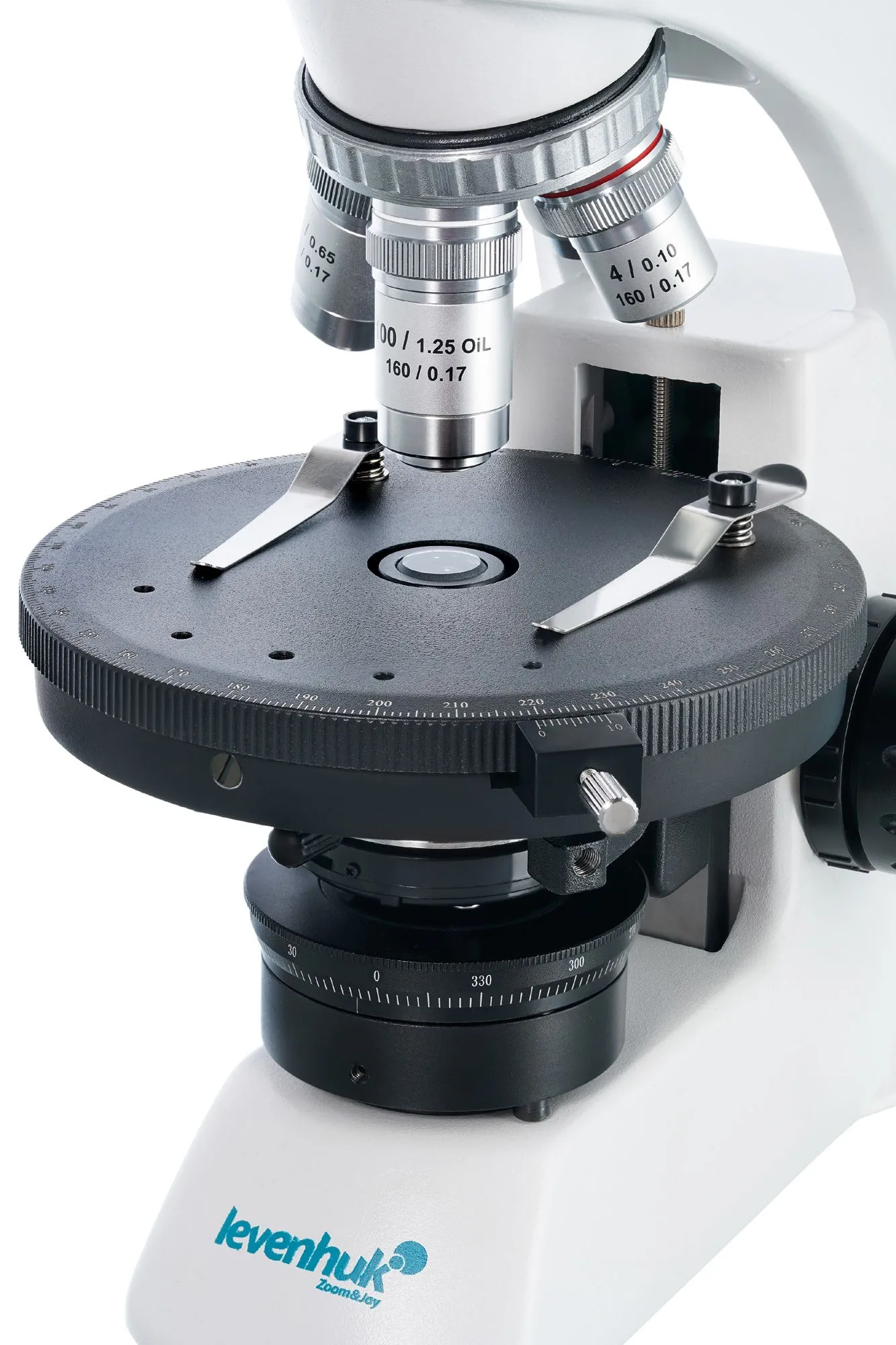 Предметный столик круглый и вращающийся, для фиксирования микропрепаратов используются классические зажимы. Под ним находится конденсор с ирисовой диафрагмой и держателем фильтра. В самом низу расположен блок подсветки – мощный 3-ваттный светодиод с коллектором. Яркость подсветки можно регулировать. Кроме того, в микроскопе есть встроенные поляризатор и анализатор.