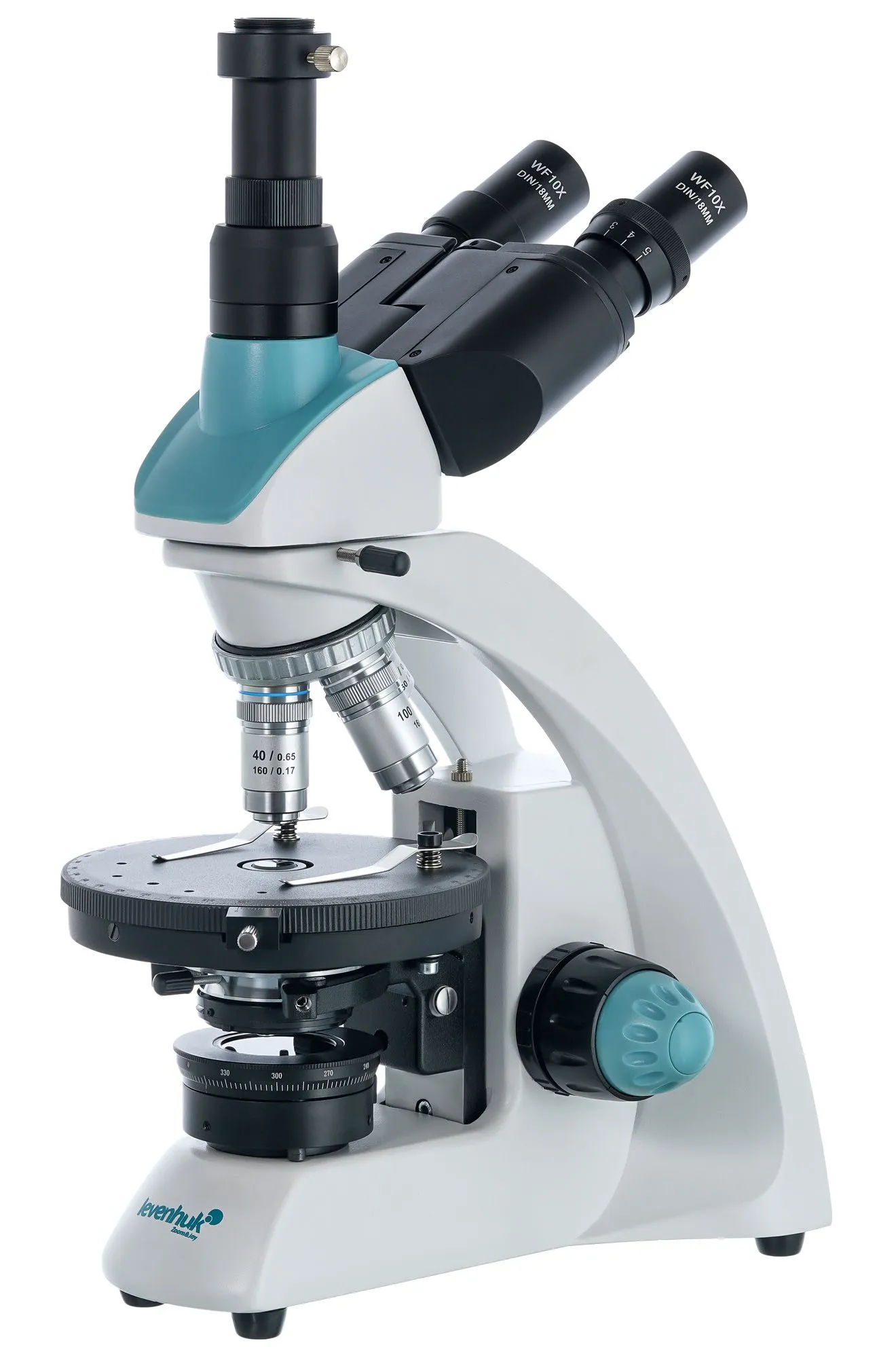 В микроскопе установлена тринокулярная насадка: бинокулярная визуальная часть имеет небольшой наклон, окулярная трубка для установки цифровой камеры расположена вертикально. Насадку можно вращать на 360°. Оптическая схема состоит из широкопольных окуляров с 10-кратным увеличением и ахроматических объективов с увеличением 4х, 10х, 40х и 100х. Передние линзы объективов 40х и 100х снабжены защитой – пружинящими оправами. Используя объектив 100х, можно вести исследования иммерсионным методом. Доступны грубая и точная фокусировка.