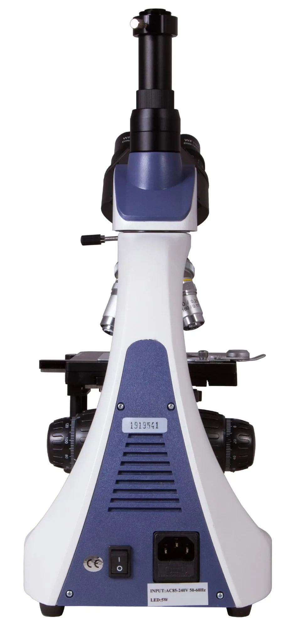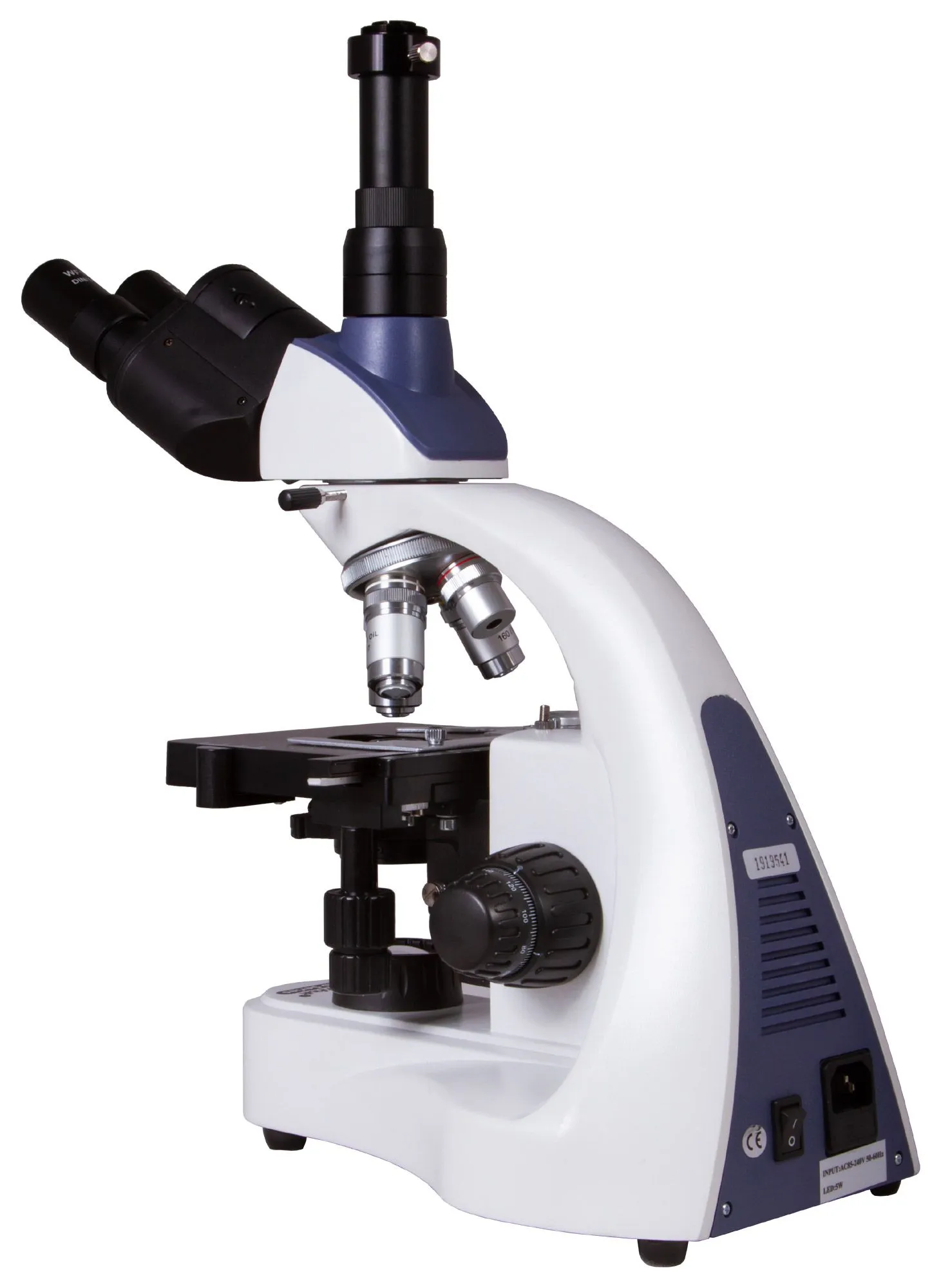 Тринокулярная насадка представляет собой бинокулярный визуальный узел и отдельную трубку для установки цифровой камеры (камера в комплект не входит). Визуальная часть отклонена на угол в 30°, что делает длительные наблюдения более комфортными. Насадку можно вращать вокруг оси на 360°. На микроскоп установлены четыре ахроматических объектива с разным увеличением, 40-кратный и 100-кратный объективы снабжены защитными пружинящими оправами. Кроме того, 100-кратный объектив может использоваться для масляной иммерсии (флакон с маслом входит в комплект поставки). Широкопольные окуляры имеют диоптрийную коррекцию и обеспечивают хороший обзор. Все комплектные оптические элементы защищены антигрибковым покрытием.