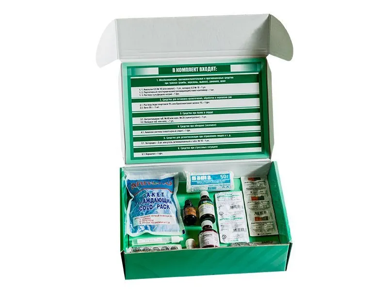 Комплект аптечки медицинской учебной включает в себя средства, необходимые для оказания первой медициниской помощи.