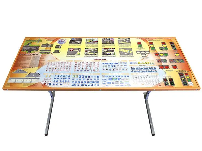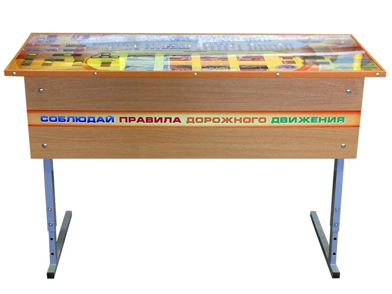 На столе-эко стиль, сделанном из дерева, закреплены иллюстрации различных дорожных событий с комментариями по ПДД.