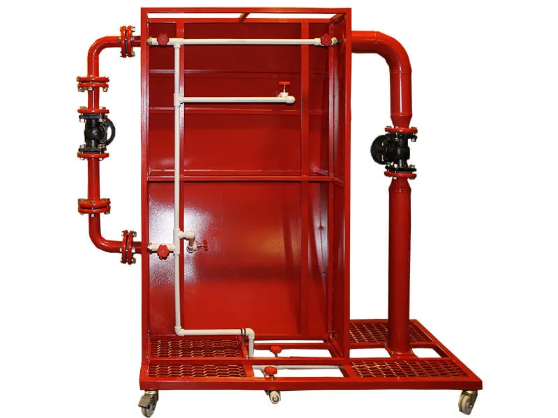 В пожарном тренажере реалистично представлен резервуар, выполненный в виде участка его цилиндрической поверхности с массивом труб, фланцев и клапанов, установленных на платформе.