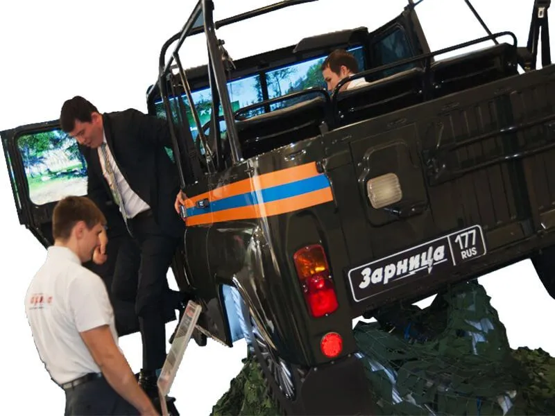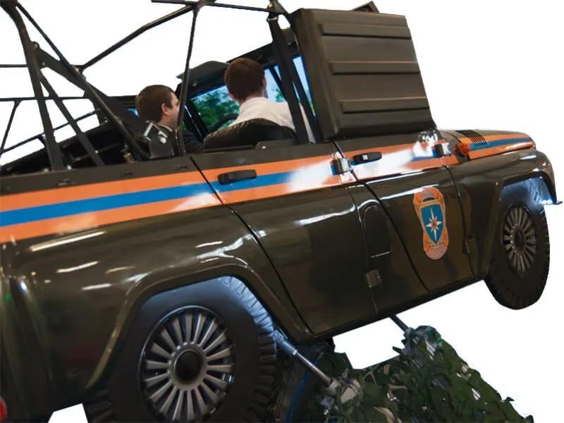 Автотренажер контраварийного вождения «УАЗ-4/МЧС» (оригинальный кузов автомобиля УАЗ, установленный на шестистепенную динамическую платформу)