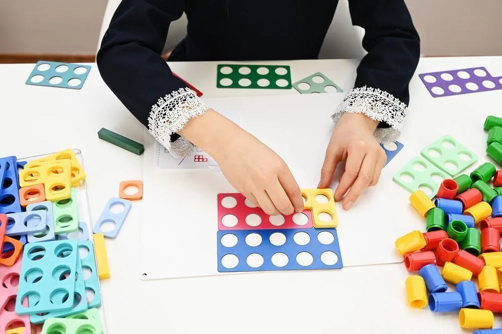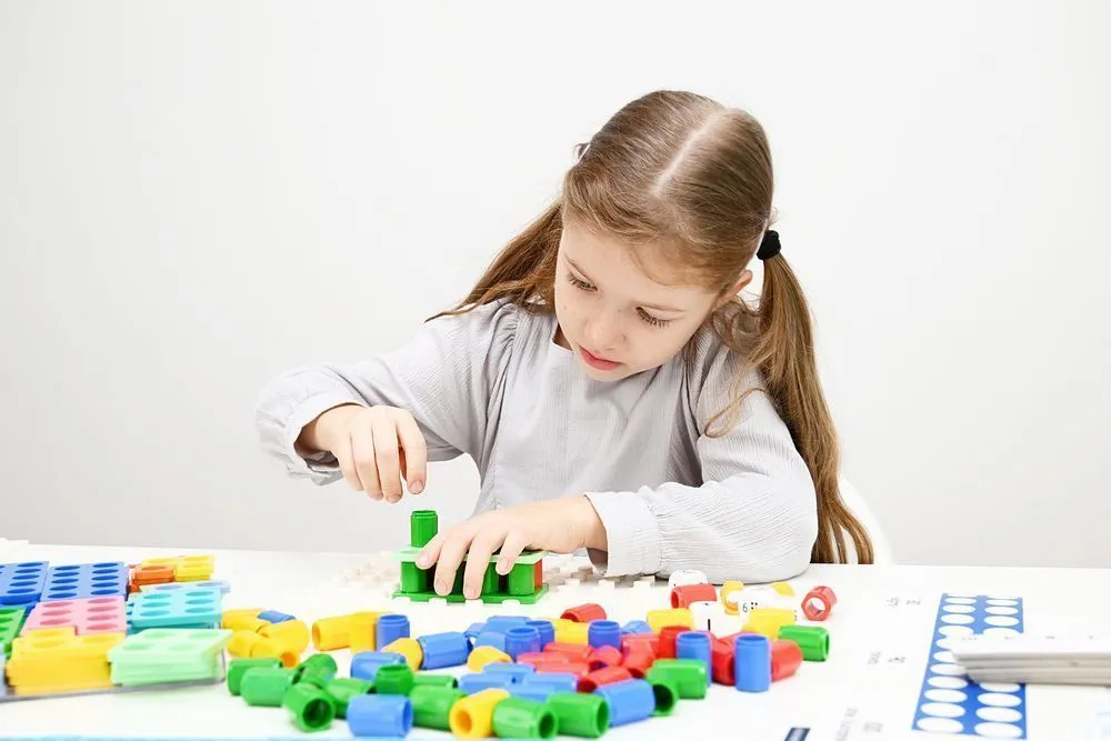 На начальных этапах дети составляют из шаблонов разнообразные сооружения и конструкции, играют в игры с использованием мешочка, в котором фигурки можно распознать только на ощупь, учатся сравнивать и сопоставлять название числа с пластиковыми шаблонами с отверстиями.