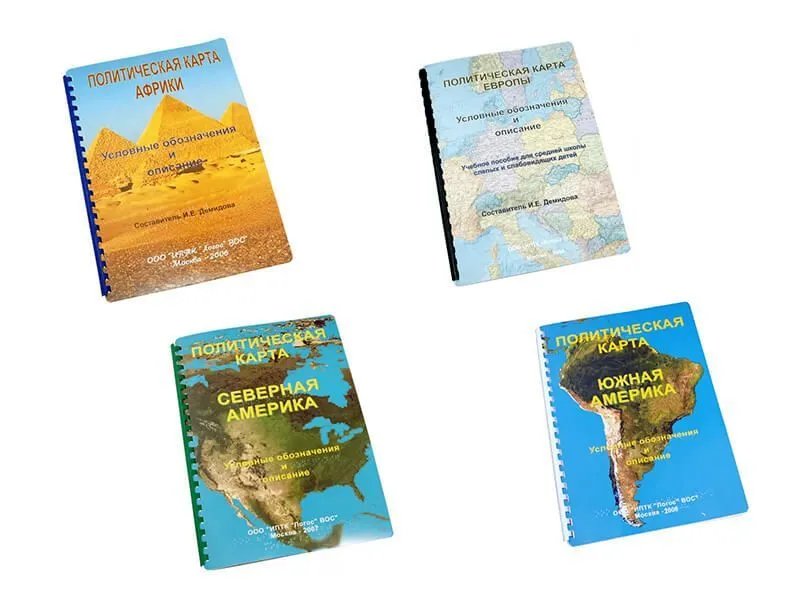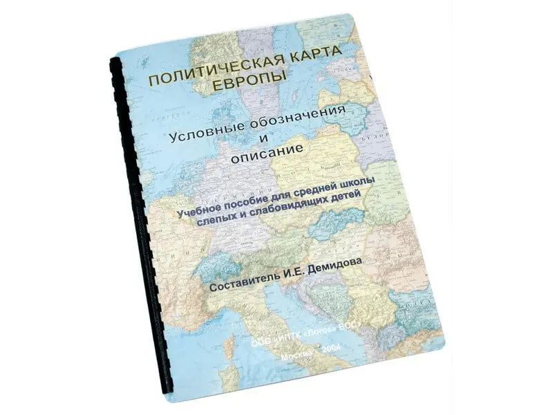 - Пособия для незрячих включают в себя рельефную карту, сделанную на прозрачной полимерной пленке, которая сочетается и скрепляется с цветной версией, напечатанной на прочной бумаге